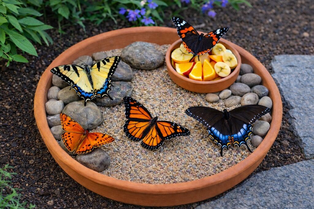 In nature, butterflies gather on damp soil and sand to drink and absorb minerals. This behavior is called puddling. A puddling station recreates this natural resource, giving butterflies a place to hydrate and gain nutrients they cannot get from flowers alone.